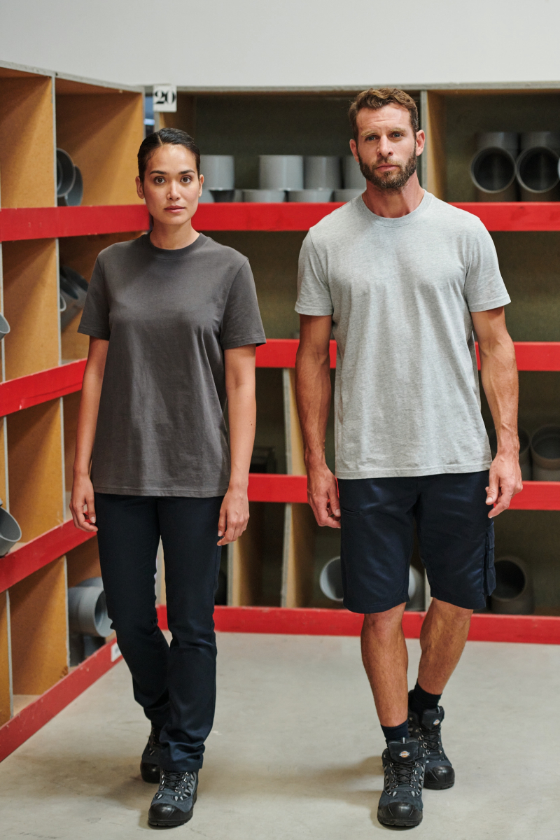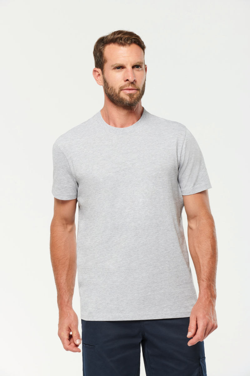 Coloris unis : 100% coton biologique | Coloris chinés : 92% coton biologique / 8% polyester | Coloris fluorescents : 65% polyester recyclé / 35% coton | Coupe droite | Encolure ronde en bord-côte 2x1 avec élasthanne et bande de propreté orange sur les couleurs unies et chinées et ton sur ton sur les couleurs fluorescentes | Finition double aiguille au bas de manches et de vêtement | Etiquette de marque Tear Away | Certifié STANDARD 100 by OEKO-TEX®N° CQ1007/7, IFTH |