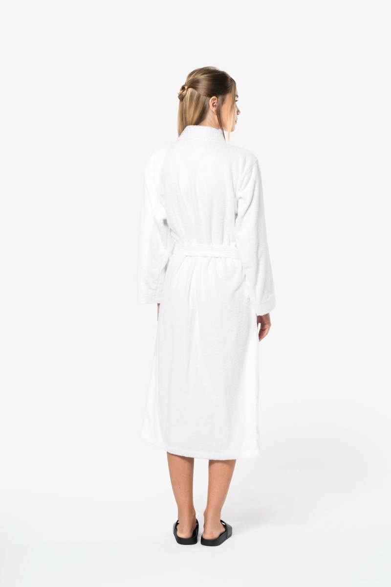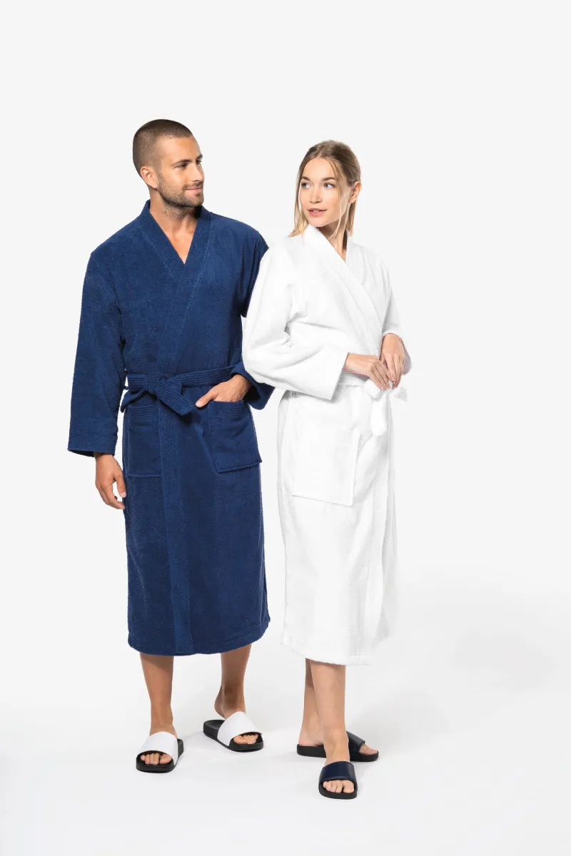 Le Peignoir col kimono Kariban K115 répond aux besoins des établissements tels que hotels ou centres de soins et spa. Confectionnée en coton, et avec un col kimono il est confortable et doux. Ce modèle peut être personnalisé par broderie.